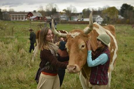 Training sessions are usually done by Christopher Bergen who has also lead [sic] general driving and experiential lessons in dealing with the oxen. [Ben] Dube closed out with a few tips. “To be a good teamster, you need to be sensitive and attentive, but also not afraid to express authority and dominance. I think that most people who start out on Bill and Lou have more trouble with the latter. Sometimes you have to be a little mean with them, which isn’t easy to do with such sweet animals. I don’t like it, but over time, you learn that they don’t really resent it or mind it much.” [emphasis added] In being around Bill and Lou I have seen that this is definitely the case, and understanding how to work with them is a good learning experience.animal rights, vegetarianism, Vermont